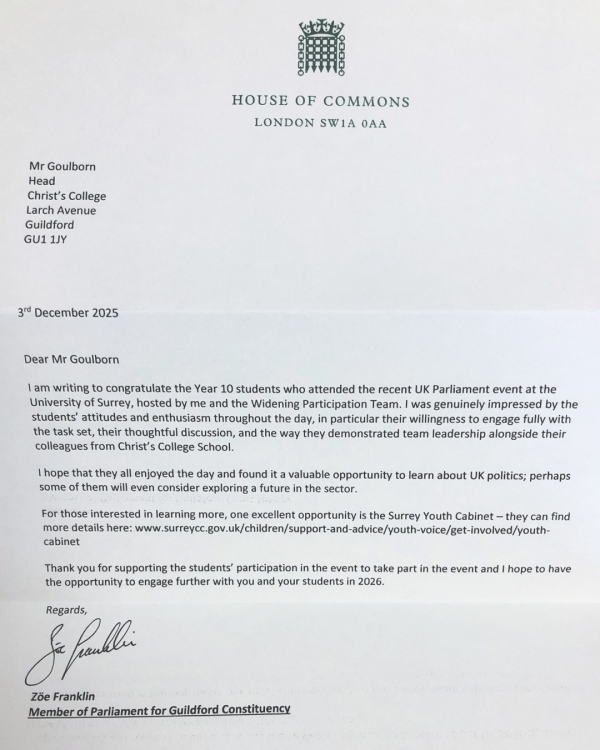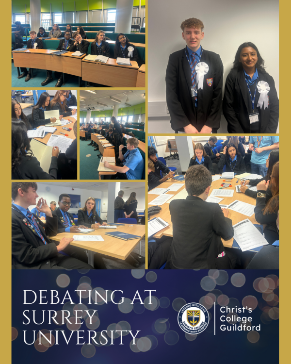 Mr Kay took a group of Y10 students on an exciting politics and debating trip hosted by the Politics and International Relations department at the University of Surrey. Our students had the opportunity to participate in a hustings, a mock election, and a mock debate! At the end of the session, Zoe Franklin, MP for Guildford, answered questions about the world of politics.