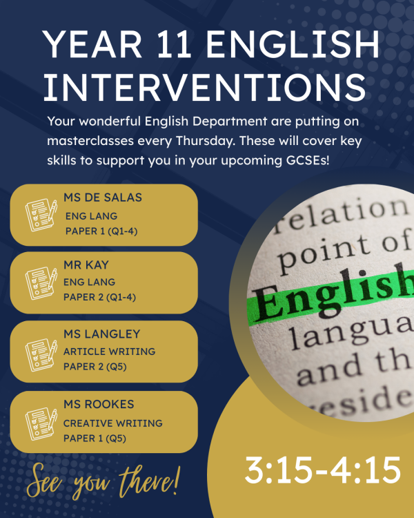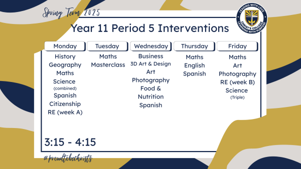 Calling all Y11s 📣 GCSE interventions will be running this term to support you in your preparation for GCSEs. Here is the timetable - for more details, speak to your subject teachers. This is an incredibly important time to be focussing on your key GCSE skills, and these interventions are here to make sure you excel!