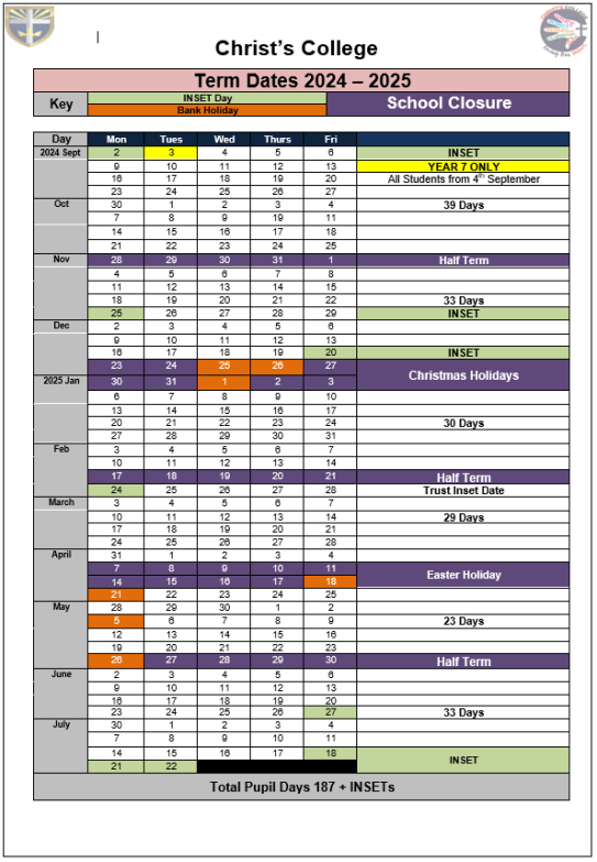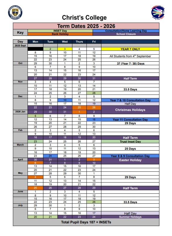 Term Dates Click below to download PDF: Term Dates 2025/2026 2025/2026 Michaelmas Term First day of term 2nd Sep 2025 Half Term 27th Oct 2025 - 31st Oct 2025 Last day of term 19th Dec 2025 Winter holidays 22nd Dec 2025 - 2nd Jan 2026 Further Information Tuesday 2nd September 2025 - INSET Day Wednesday 3rd September 2025 - Year 7 Only All students return Thursday 4th September 2025 Friday 28th November 2025 - INSET Day Friday 19th December 2025 - Half Day Lent Term First day of term 6th Jan 2026 Half Term 16th Feb 2026 - 20th Feb 2026 Last day of term 27th Mar 2026 Easter/Spring holidays 30th Mar 2026 - 10th Apr 2026 Further Information Monday 5th Jan 2026 - INSET Day Trinity Term First day of term 13th Apr 2026 Half Term 26th May 2026 - 29th May 2026 Last day of term 21st Jul 2026 Summer holidays 22 Jul 2026 - 2nd Sep 2026 Further Information Monday 4th May 2026 - Bank Holiday Monday 25th May 2026 - Bank Holiday Friday 26th June 2026 - INSET Day Friday 17th July 2026 - Half Day Monday 20th July 2026 - INSET Day Tuesday 21st July 2026 - INSET Day